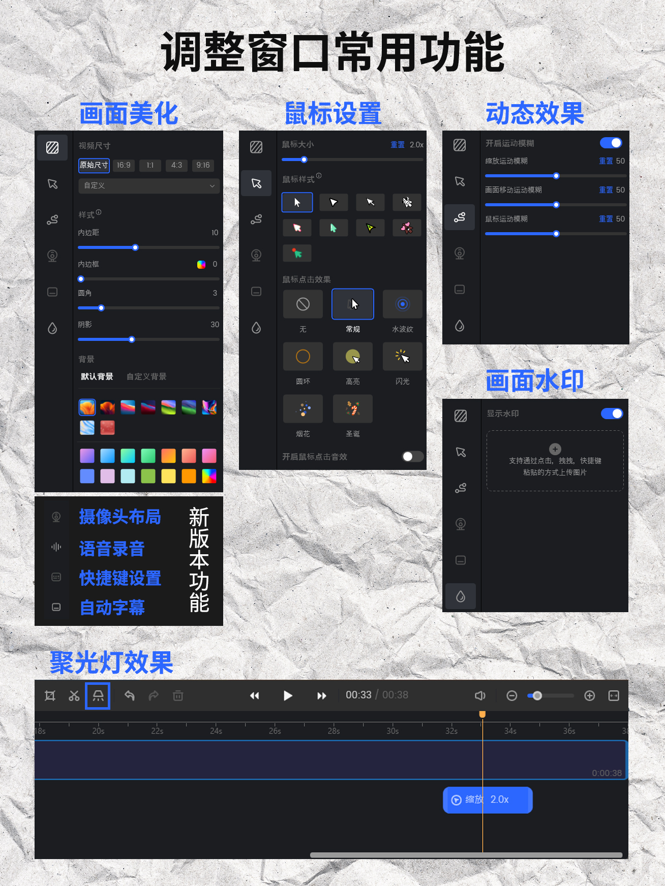 – **特色功能**:包含视频美化、鼠标设置(光标大小/样式调整、开启点击音效)、动态效果、画面水印、摄像头布局、语音录音、自动字幕、聚光灯效果、快捷键设置等,还支持免费下载,自动后期制作屏幕录制功能。